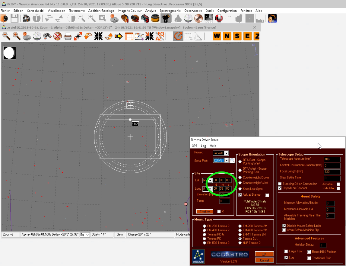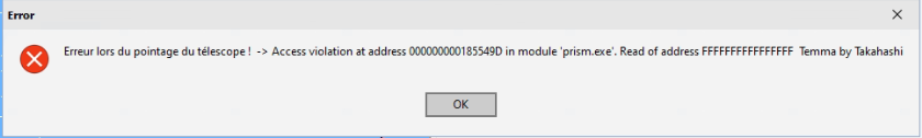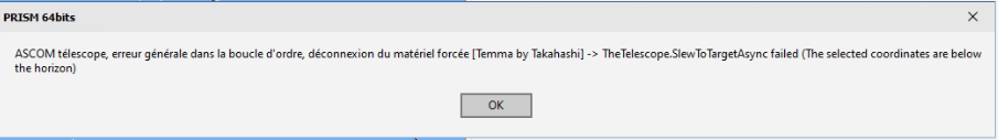 J’utilise PRISM 64 bits V11.0.1.4 du 03/11/2021 avec ma monture TAKAHASHI EM200 et le driver ASCOM TEMMA v6.2.6 en 32 bits (https://ccdastro.net/temma.html). Malheureusement les coordonnées du site passent à 0 et il est par conséquent impossible de pointer un objet car le driver renvoi une erreur de pointage indiquant que l’objet est situé sous l’horizon. Les erreurs affichées lors d'un pointage sont les suivantes : PS : Ma configuration (setup) du 04/11/2021
