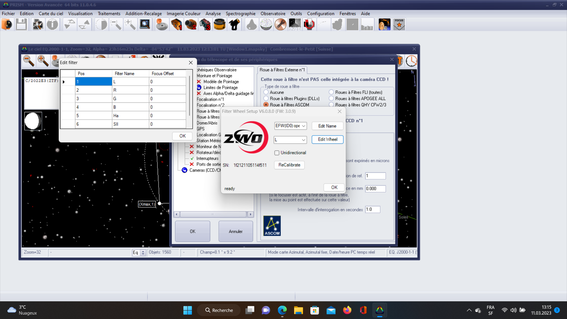 J'ai Prism 11, j'ai pu connecter le matériel comme sur les images jointes, seul problème, quand j'active la ccd 1 la fenêtre des filtres n'apparait pas.