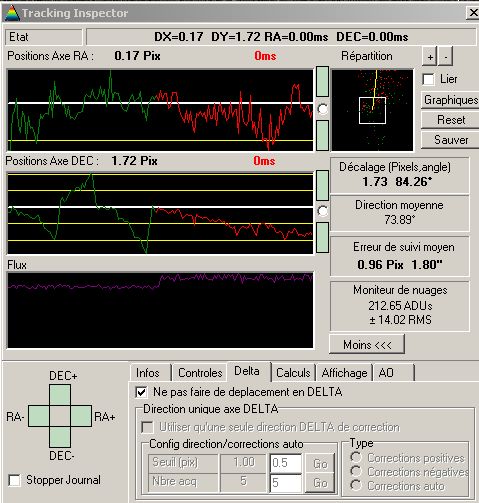 En vert avec en rouge sans Pour dire toute la vérité j'ai remarqué que j'avais mis 2Px de jeu en Dec mais même en mettant 0Px et en relaçant le guidage cela ne guidait pas bien. Je suis sorti de Prism et j'ai fait un test avec CCD-Soft et cela fonctionnait correctement et de retour dans Prism cela à finalement fonctionner normalement. Bon je ne sais pas si c'est un bug aléatoire ou si le jeu est bien pris en compte en cas de changement