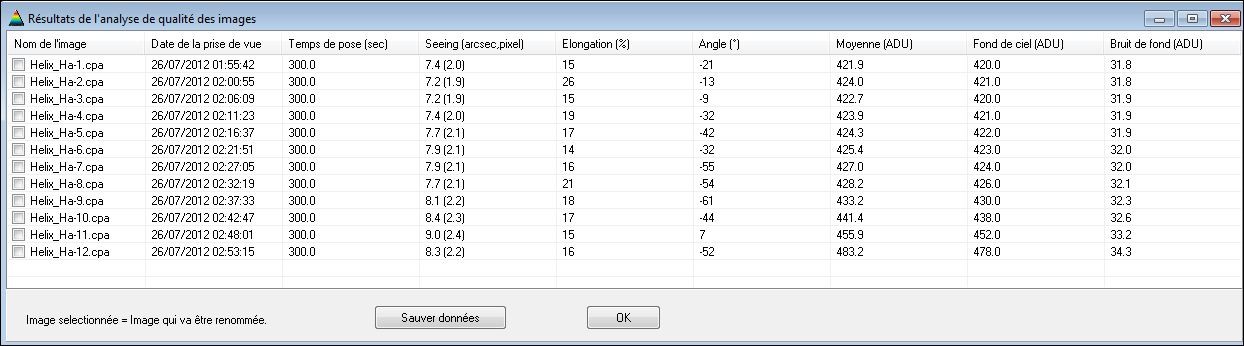 Cette fiche permet de selectionner les images de la nuit et de les eliminer selon les criteres de fond de ciel ou de FWHM des etoiles...