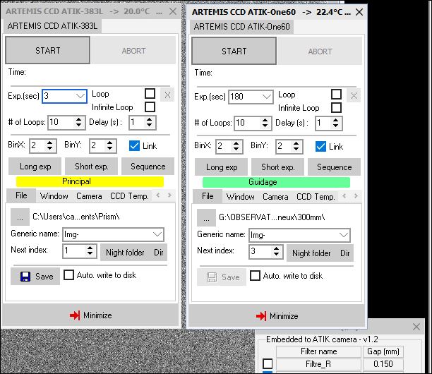 Quand je lance Prism (V10.3.60.490) et que je lance la caméra 1 (Atik 4000M) il apparaît le panneau de contrôle, ça marche, mais quand je lance la caméra 2 (Atik 16ic) j'obtiens le panneau dela 4000, avec sous les contrôles d'exposition un bande colorée avec écrit "Atik 16ic" et à partir de là le message d'erreurs "erreur d’initialisation caméra violation à l'adresse xxxxx dans Atik.Core.dll"