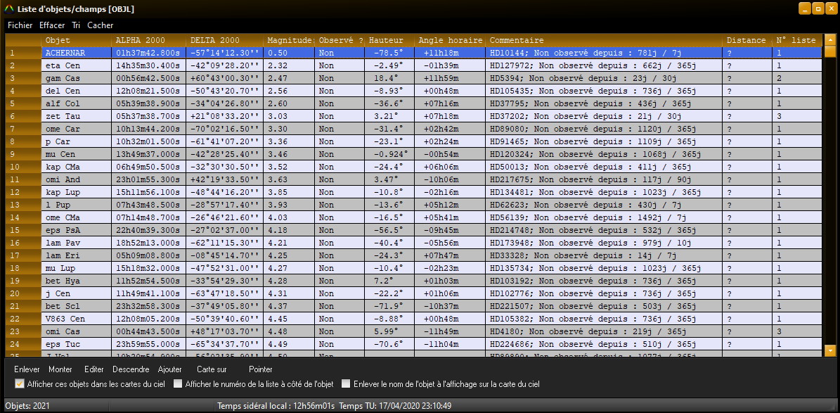 Il est possible d'aller charger pour le moment 3 listes de catalogues et de les faire apparaître par ordre de priorité d'observation dans la carte du ciel.
