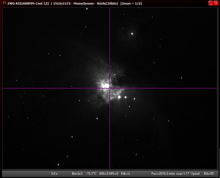 Si je déplace le télescope avec un script en utilisant les coordonnées de M42 prises par exemple sur Simbad, le coeur de M42 se trouve bien au centre.