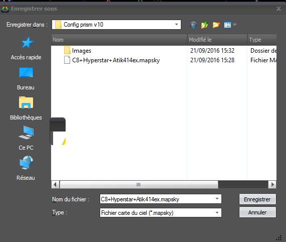 Je confirme le problème identique sur ma configuration. J'ai entouré le bug en rouge dans la copie d'écran ci-dessous. On ne peut donc pas enregistrer dans un fichier existant, pour solutionner le problème il faut donc créer un nouveau fichier de configuration du ciel.