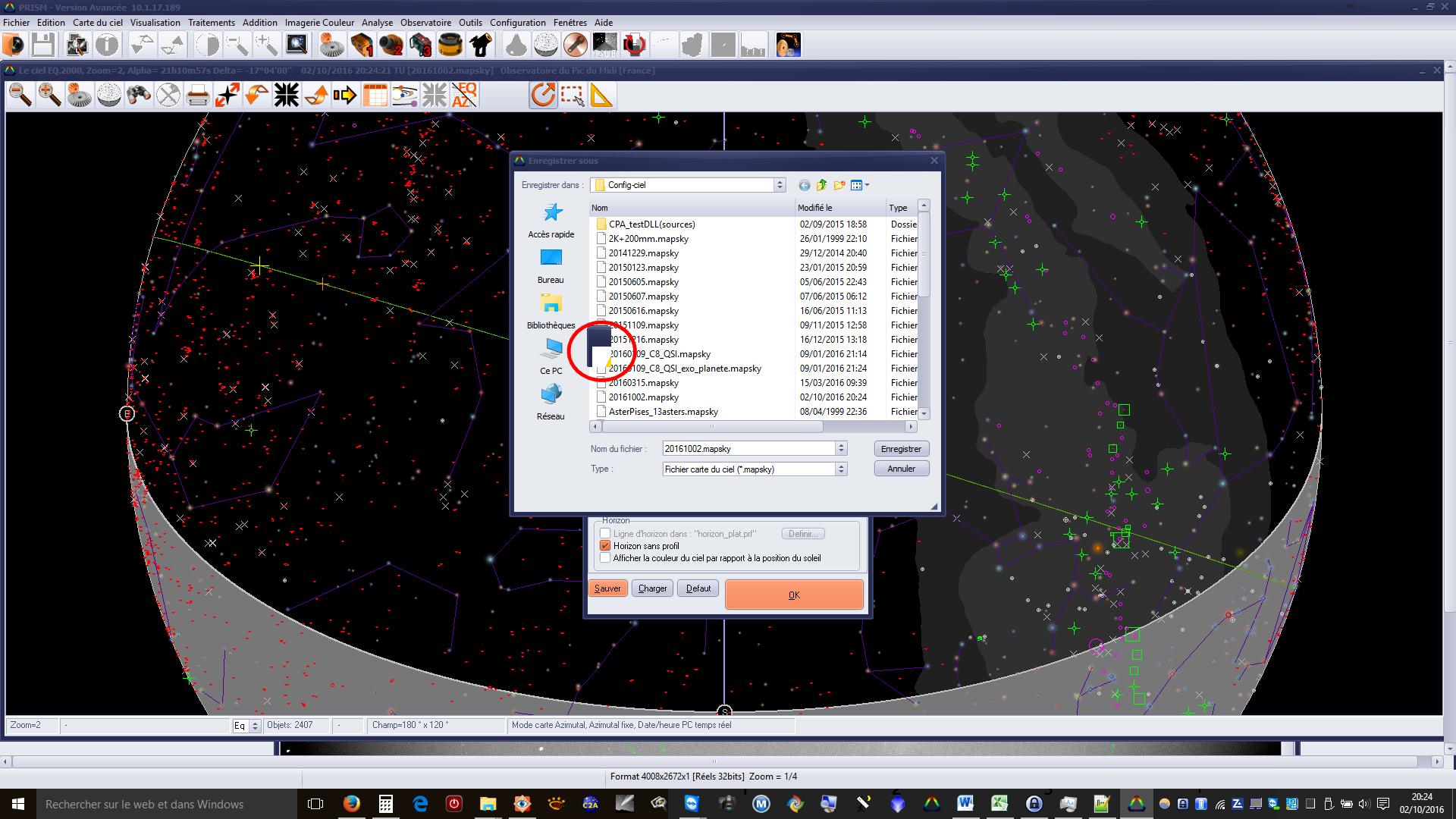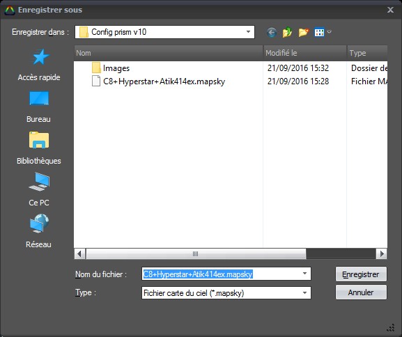 Je confirme le problème identique sur ma configuration. J'ai entouré le bug en rouge dans la copie d'écran ci-dessous. On ne peut donc pas enregistrer dans un fichier existant, pour solutionner le problème il faut donc créer un nouveau fichier de configuration du ciel.