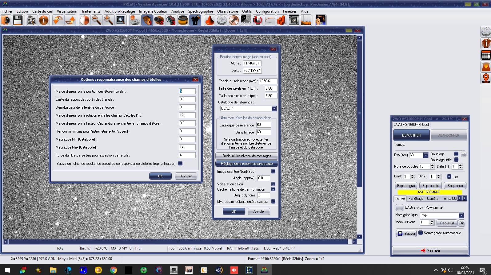 D'ailleurs, j'ai une ASI 1600 MMC, un Newton de 300 à focale 1360 mm. Je dois imager comment en astrométrie ? Car en pleine trame ou en binning 2, j'arrive à faire des la photométrie mais l'astrométrie me résiste méchamment. J'ai remarqué qu'auparavant en bin 2 pleine trame ca fonctionnait. Mais depuis que le beau temps est revenu... rien ?! Pourquoi je n'y parviens pas, c'est dingue