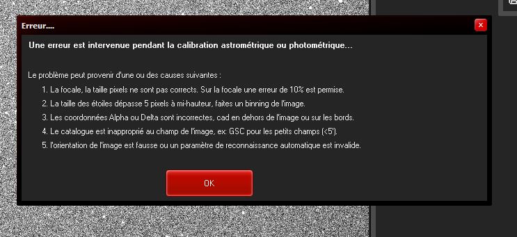 Je parle de l'étalonnage automatique qui me met que l'astrométrie a échoué pour les raisons suivantes photo jointe ce pourquoi je précise avoir ce problème et ce n'est qu'une remarque rien de désagréable de ma part d'ailleurs l'équipe de prism n'y a rien trouvé de désobligeant.