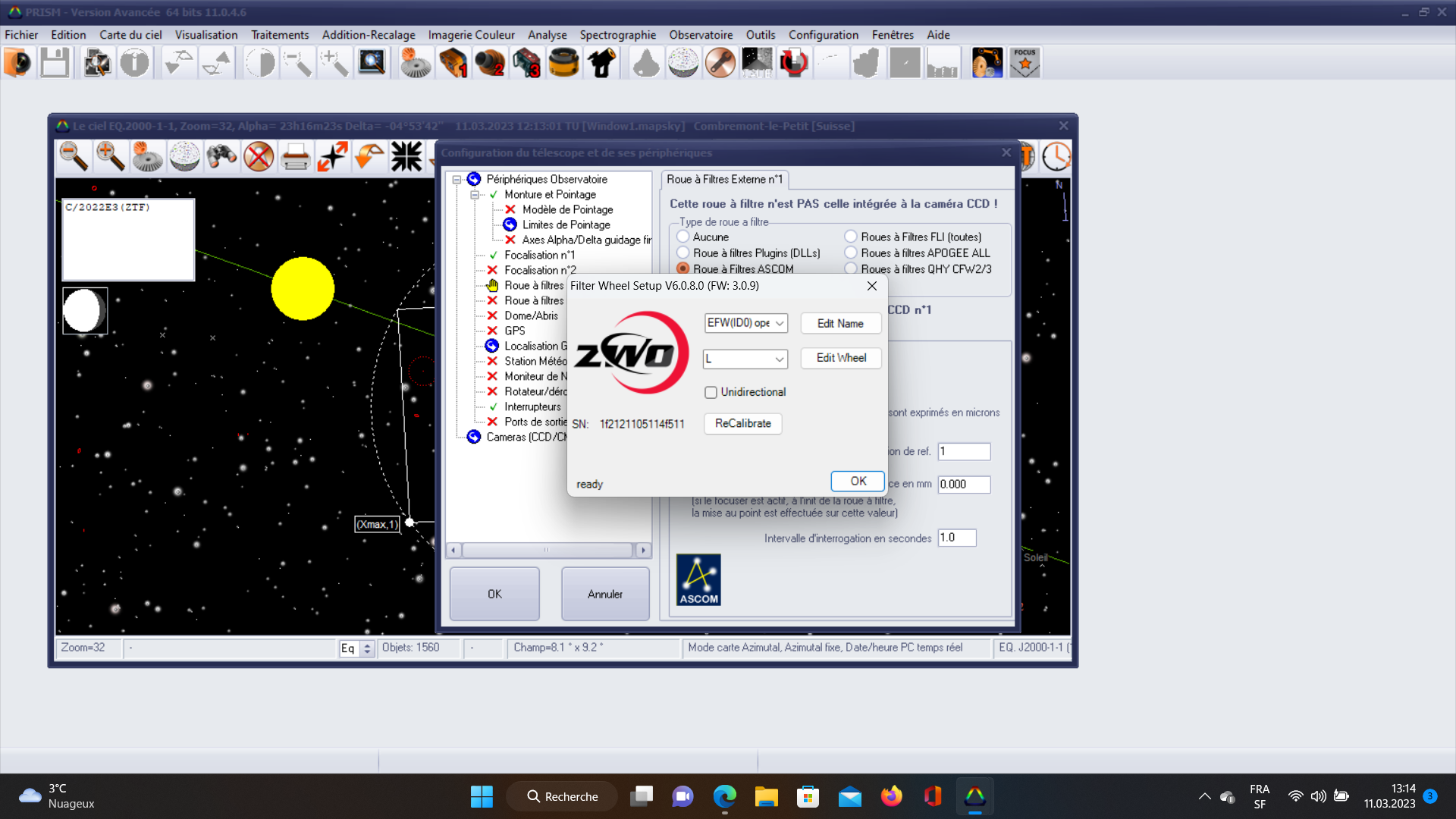 J'ai Prism 11, j'ai pu connecter le matériel comme sur les images jointes, seul problème, quand j'active la ccd 1 la fenêtre des filtres n'apparait pas.