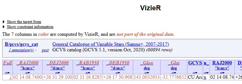 A priori, la variable CU Ari n'existe pas dans la base GCVS de Prism. Pourtant, elle est bien présente dans la base GCVS version 5 (voir copies d'écran)