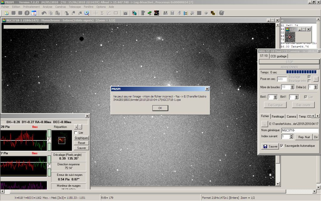je commence une séquence d'acquisition ( 18 poses de 10 min)de NGC3718 . A ma stupéfaction, à la fin de la première pose ,je reçois le message : "ne peut sauver l'image,nom de fichier incorrect" (cfr copie d'écran )
