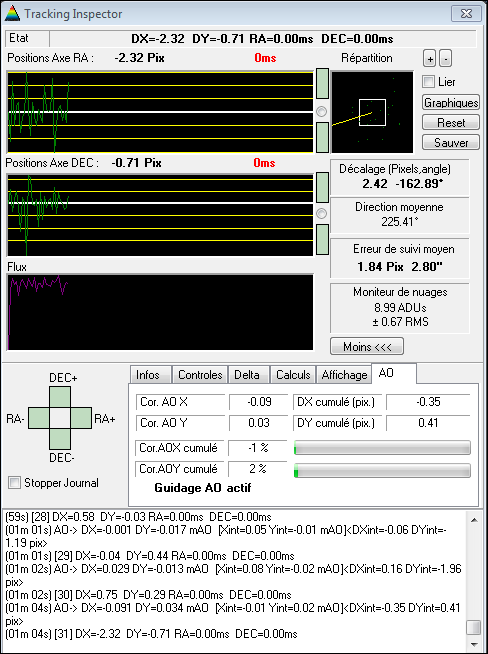 Le guidage par l'AO a une course limitée, la monture doit etre TRES bien mise en station, sinon l'AO va vite arriver en butée, dans ce cas le guidage classique reprends le relai et la barre verte est a 100% ou plus !