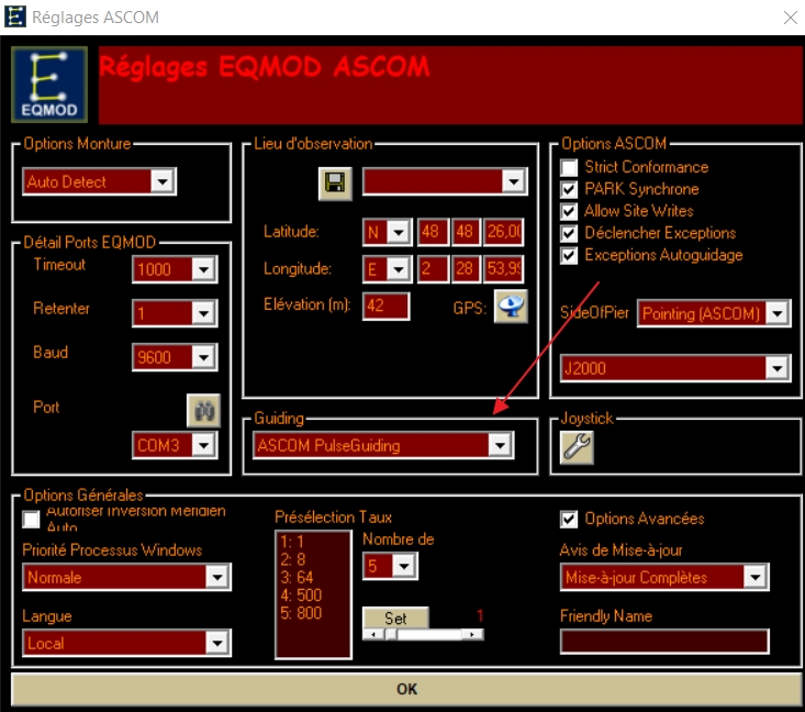 - EQMOD en Pulseguide - Caméra configurée dans prism avec la case "Utiliser les relais de guidage" décochée - Pas de câble ST4 donc