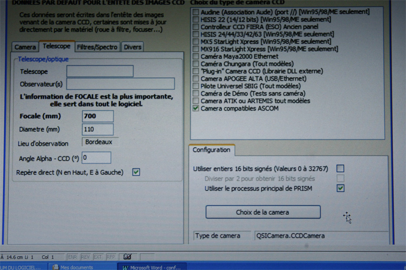 Bonjour, Il n'y a pas QSI sous la ligne caméra compatible Ascom. Je ne peut l'avoir qu'en cliquant sur "choix de la caméra" puis "ascom" et la qsi apparait