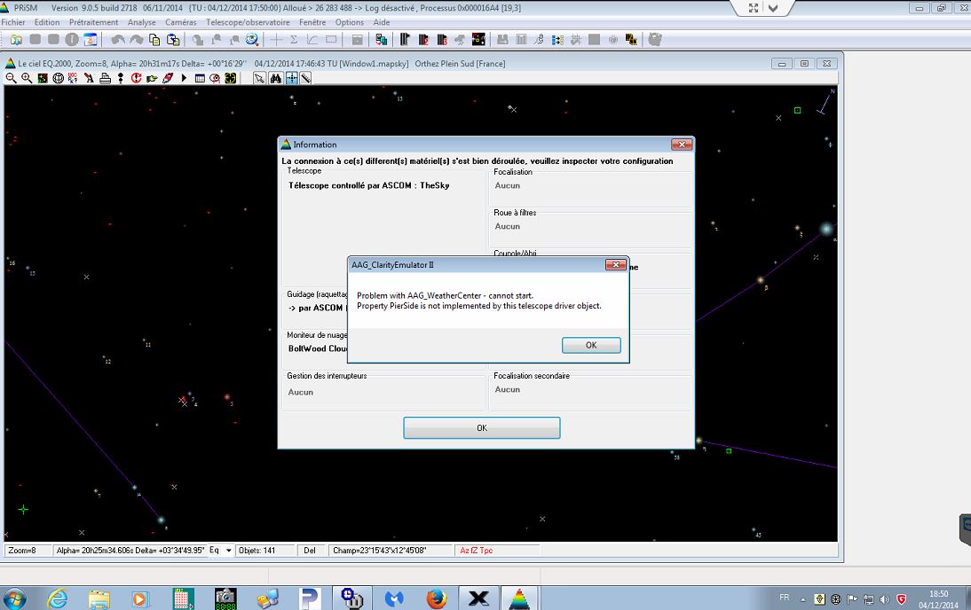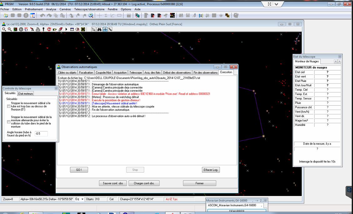 Tests effectués avec les versions 8 et 9. J'ai déconnecté la station. Mêmes résultats. Déconnexion avec v8. plantage prism 8 ss station météo 2014-12-04.JPG J'ai ensuite déconnecté aussi le détecteur. Résultat en v9: plantage p 9 ss meteo ni detecteur nuages.JPG La version 8 a elle bien évidemment f...