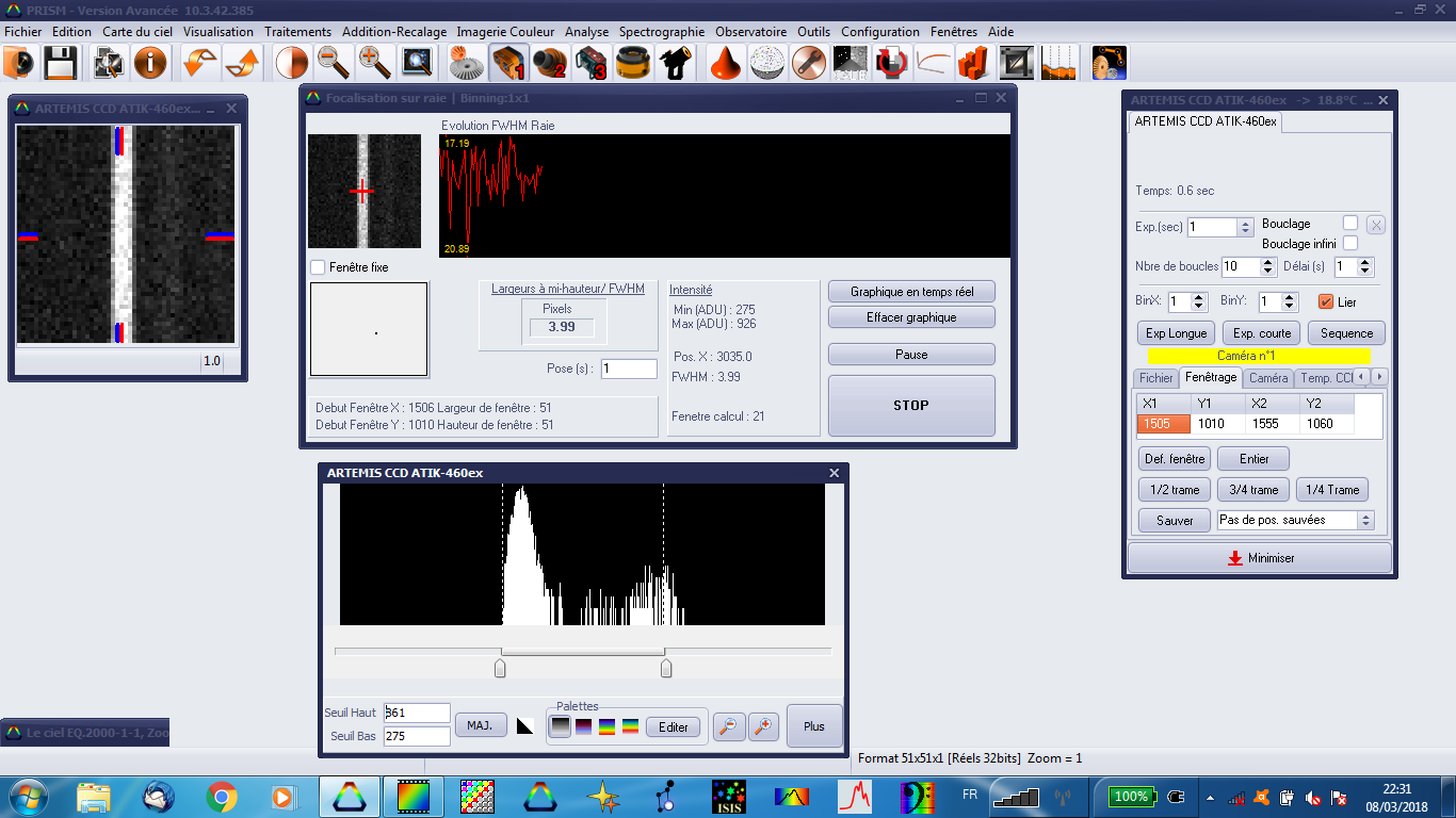 Lorsque je stoppe une action de focalisation sur raie, Prism me demande si je veux voir un historique de la focalisation sous forme de graphique mais n'autorise pas la reprise du contrôle de ma caméra (que ce soit une Atik414EX ou une ASI ZWO) Un message indiquant que l'action de focalisation n'est pas terminée s'affiche alors qu'elle est terminée. J'ai effectué plusieurs essais mais presque à chaque fois j'aboutis à ce blocage du logiciel. Et je suis obligé de redémarrer Prism puisque je n'ai plus accès à la caméra.