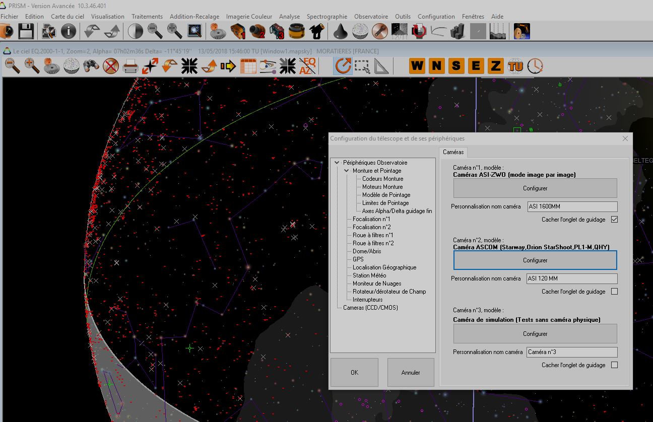 "j'utilise l'ASI 120 paramétrée Ascom dans Prism via l'onglet de connexion de la 2ème caméra dans la barre des tâches, l'ASI 1600 étant la 1ère qui est, elle, paramétrée en image par image."