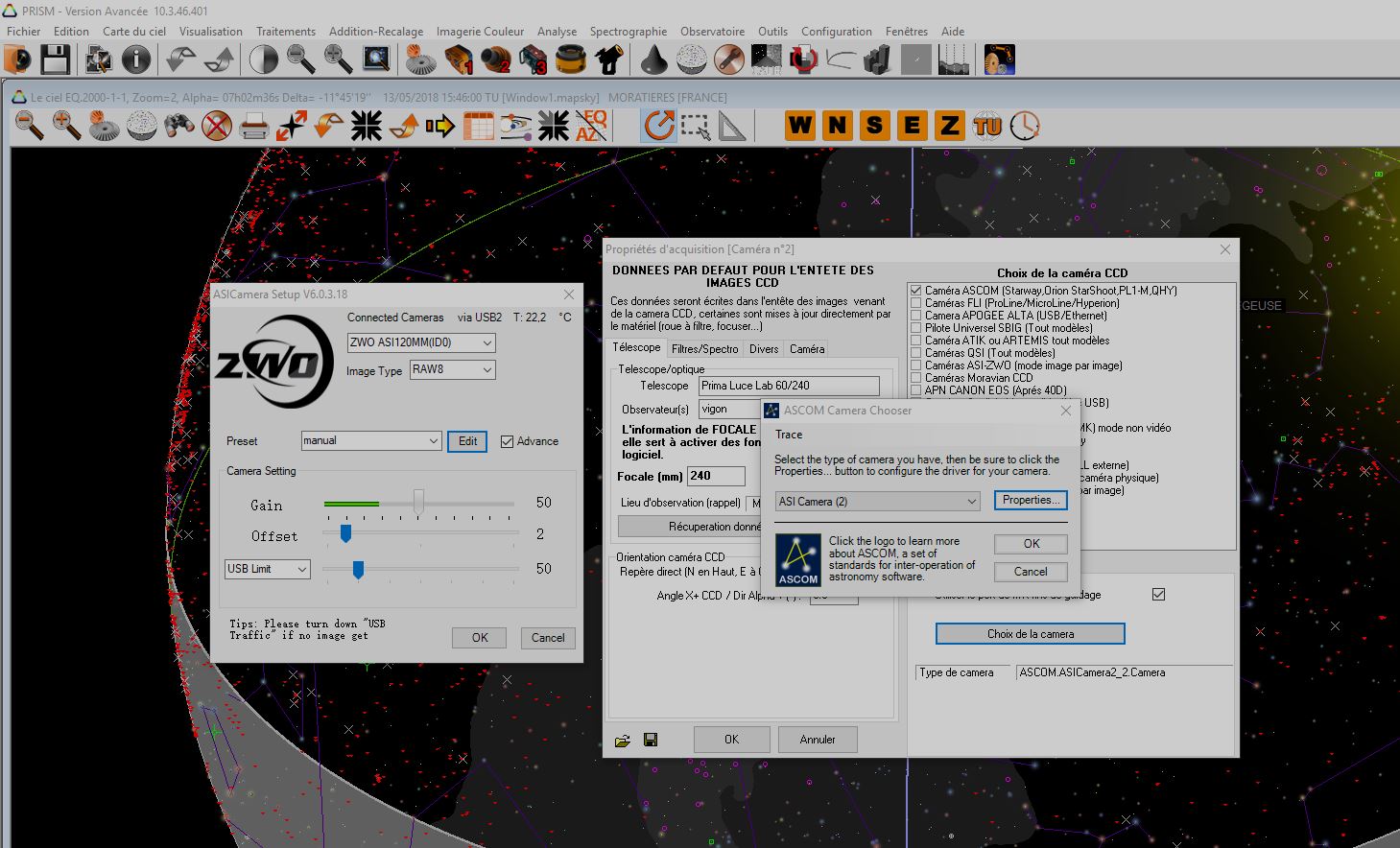 "j'utilise l'ASI 120 paramétrée Ascom dans Prism via l'onglet de connexion de la 2ème caméra dans la barre des tâches, l'ASI 1600 étant la 1ère qui est, elle, paramétrée en image par image."