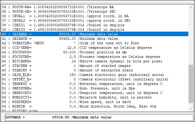 3/ Soit le logiciel que vous utilisez ne lit pas les entêtes FITS étendues (je ne sais plus à partir de combien de mots-clés un header FITS devient étendu).