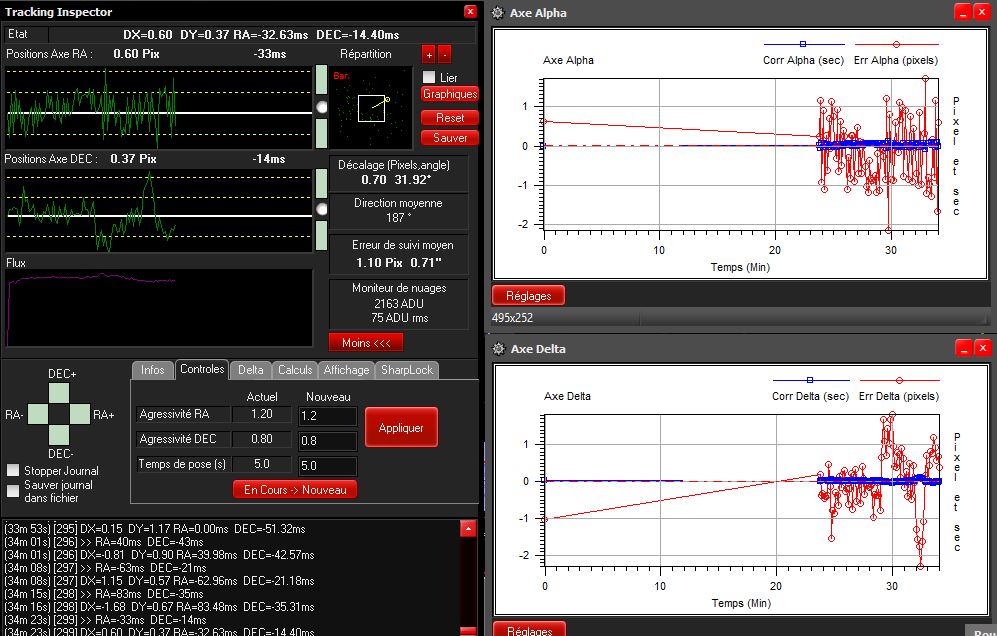 Concernant l'autoguidage, tout fonctionne relativement bien, je me demande toutefois si ma configuration est perfectible. Voici les résultats que j'obtiens au courant d'une nuit d'acquisition avec un seeing moyen :