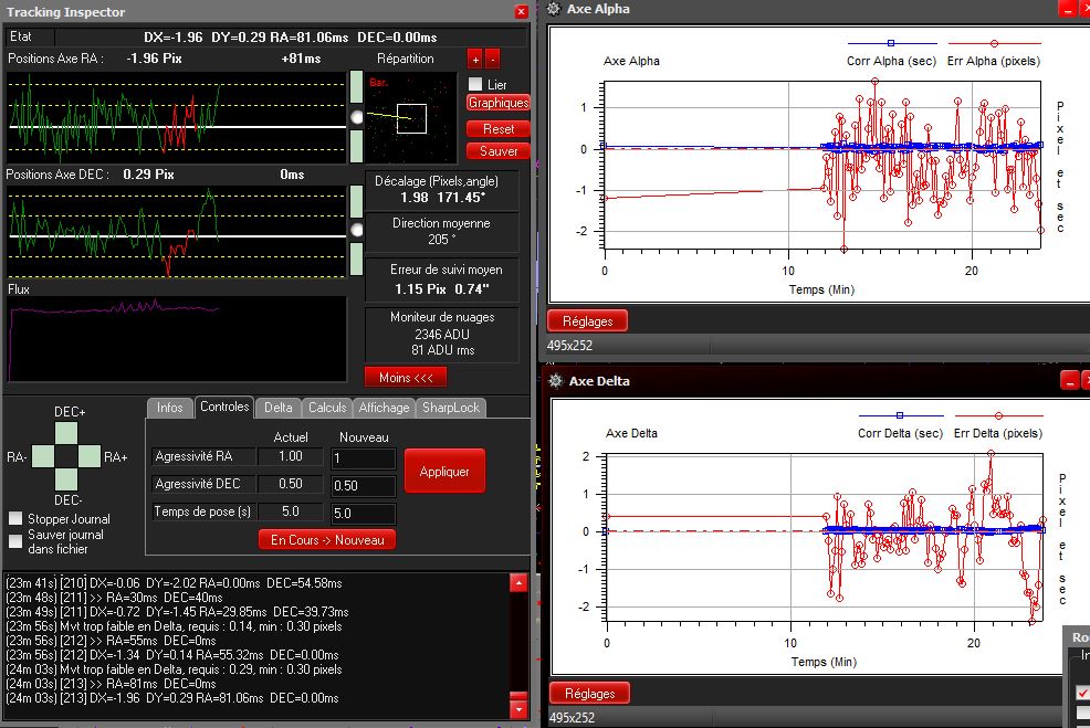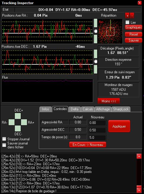 Concernant l'autoguidage, tout fonctionne relativement bien, je me demande toutefois si ma configuration est perfectible. Voici les résultats que j'obtiens au courant d'une nuit d'acquisition avec un seeing moyen : La config : et un centroïde au centre de l'image : Constatez-vous un paramètre qui pourrait être amélioré ou modifié ?