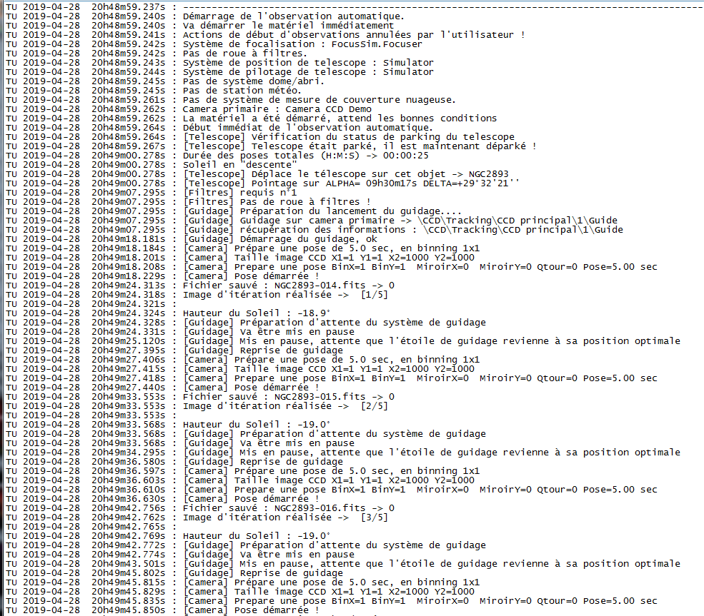 Par contre maintenant en obs auto, durant les acquisitions il rajoute des étapes de [Guidage] : mise en pause du guidage, recalage de l’étoile de guidage, puis reprise du guidage ce qui prends environ 5 sec entre chaque pose :