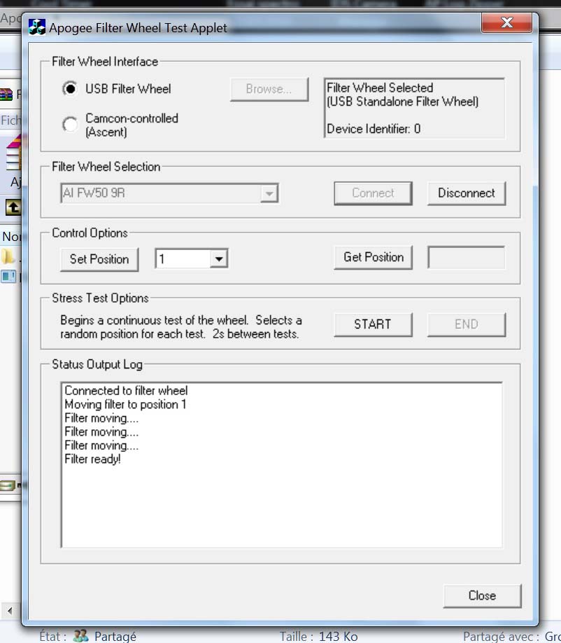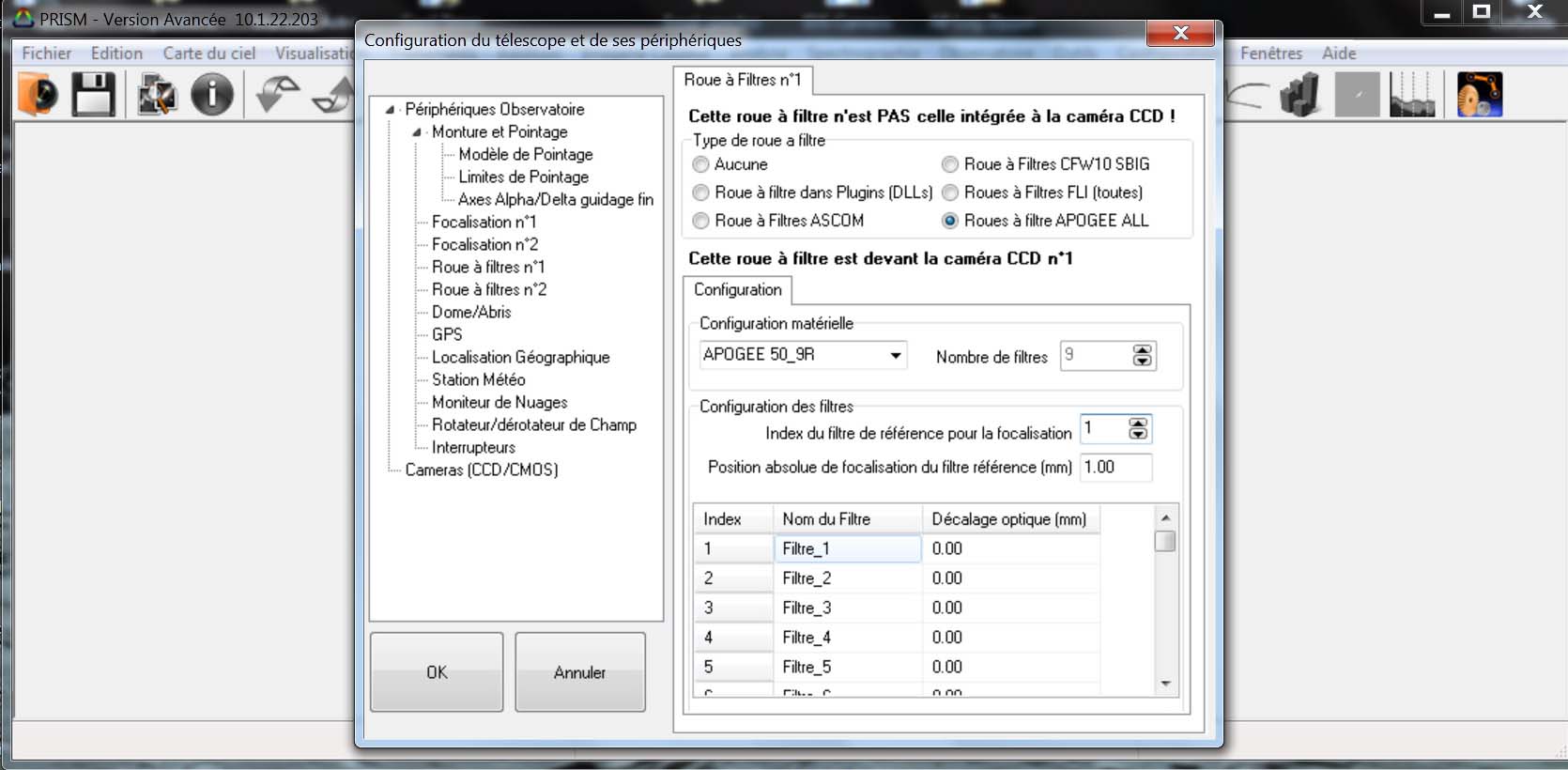 Le driver Apogee "Filter wheel test.exe" a permis vérifier le bon fonctionnement de cette roue à filtres… mais aucun fonctionnement avec Prism 9 et 10 ? Je ne comprends pas ce qui peut empêcher son pilotage par Prism, Alcor précisant qu'Apogee est intégré à Prism 10 .