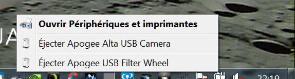 à la mise sous tension de la roue à filtres, celle-ci fait son tour complet pour se caler sur la position 1. À la connexion USB, celle-ci est confirmée par Windows en bas à droite dans la barre des tâches.