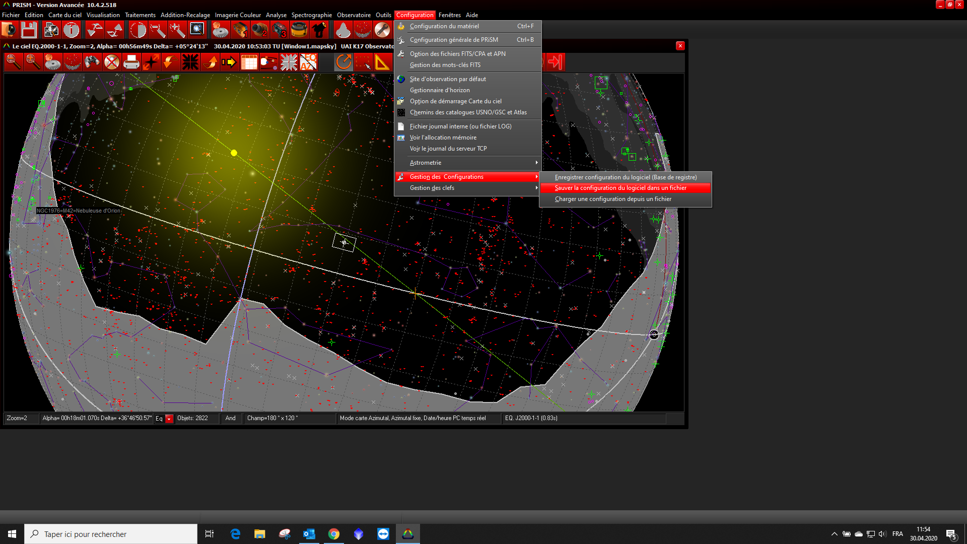 C14 edge HD F7.7 avec caméra Moravian G2-4000, connecté comme caméra n°1 dans Prism V10, guidage par OAG avec une Lodestar X2 connectée en caméra n°2