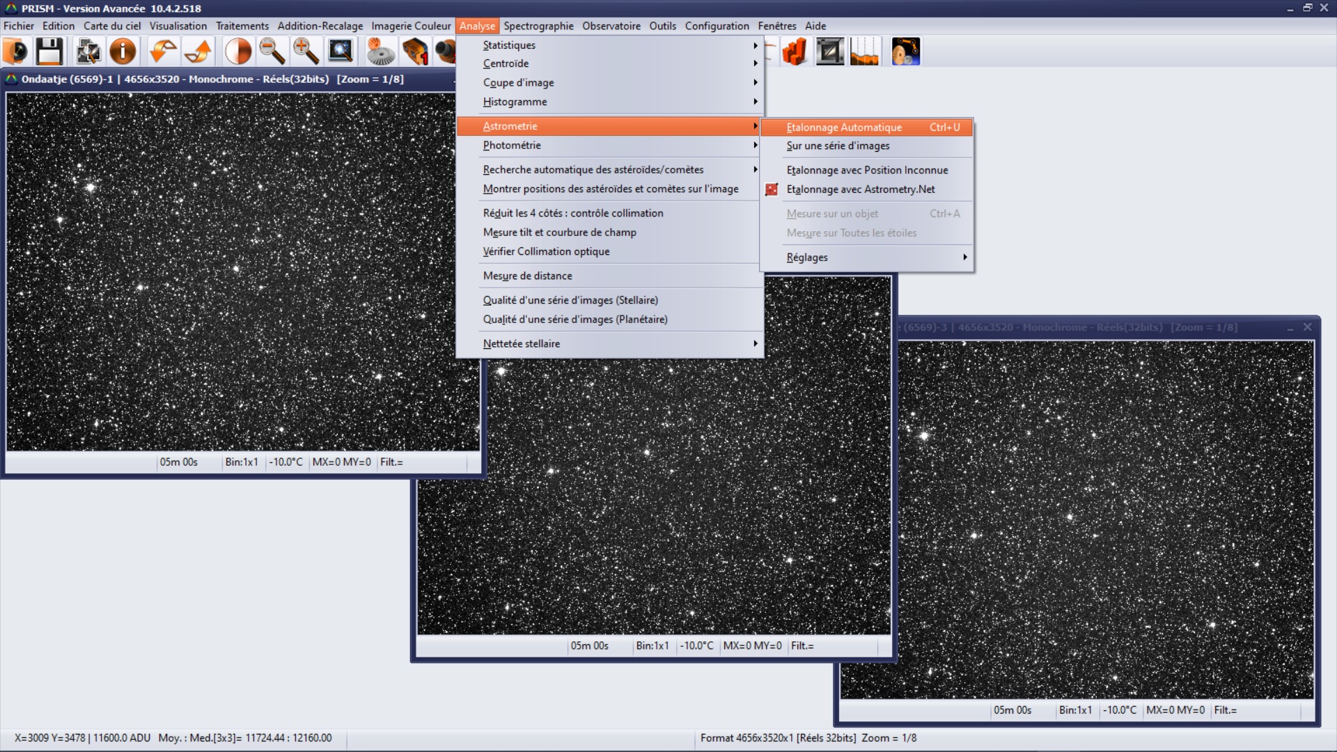 A noter aussi que la calibration astrométrique via Astrometry.net est plus "souple" que celle de Prism dans le sens où les coordonnées RA/DEC de l'entête de l'image peuvent être totalement fausses par rapport à la réalité du champ pointé, dans ce cas la calibration via Astrometry.net marchera car il cherche sur tout le ciel tandis que la calibration via Analyse / Astrométrie / Etalonnage automatique est plus stricte, il faut que les coordonnées RA/DEC de l'entête de l'image correspondent à peu-près aux coordonnées réelles du centre du champ.
