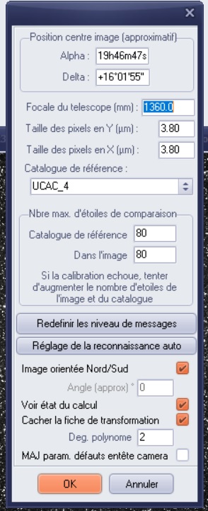 Thomas MOLLIER a écrit : 05 juin 2020, 18:12 Deuxième question : je calibre astrométriquement par le biais d'Astrometry.Net. La calib' automatique ne fonctionne jamais :?: :| Pourtant lors des acquisition, une fois la réduc' faite avec Astrometry.Net, ca fonctionne bien. Je refais le même boulot en traitement quelques jours après, ca ne fonctionne plus... :shock: