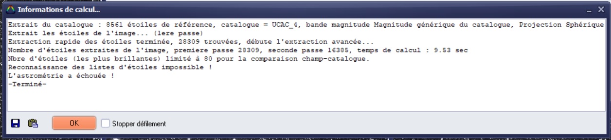 Deuxième question : je calibre astrométriquement par le biais d'Astrometry.Net. La calib' automatique ne fonctionne jamais :?: :| Pourtant lors des acquisition, une fois la réduc' faite avec Astrometry.Net, ca fonctionne bien. Je refais le même boulot en traitement quelques jours après, ca ne fonctionne plus... :shock: