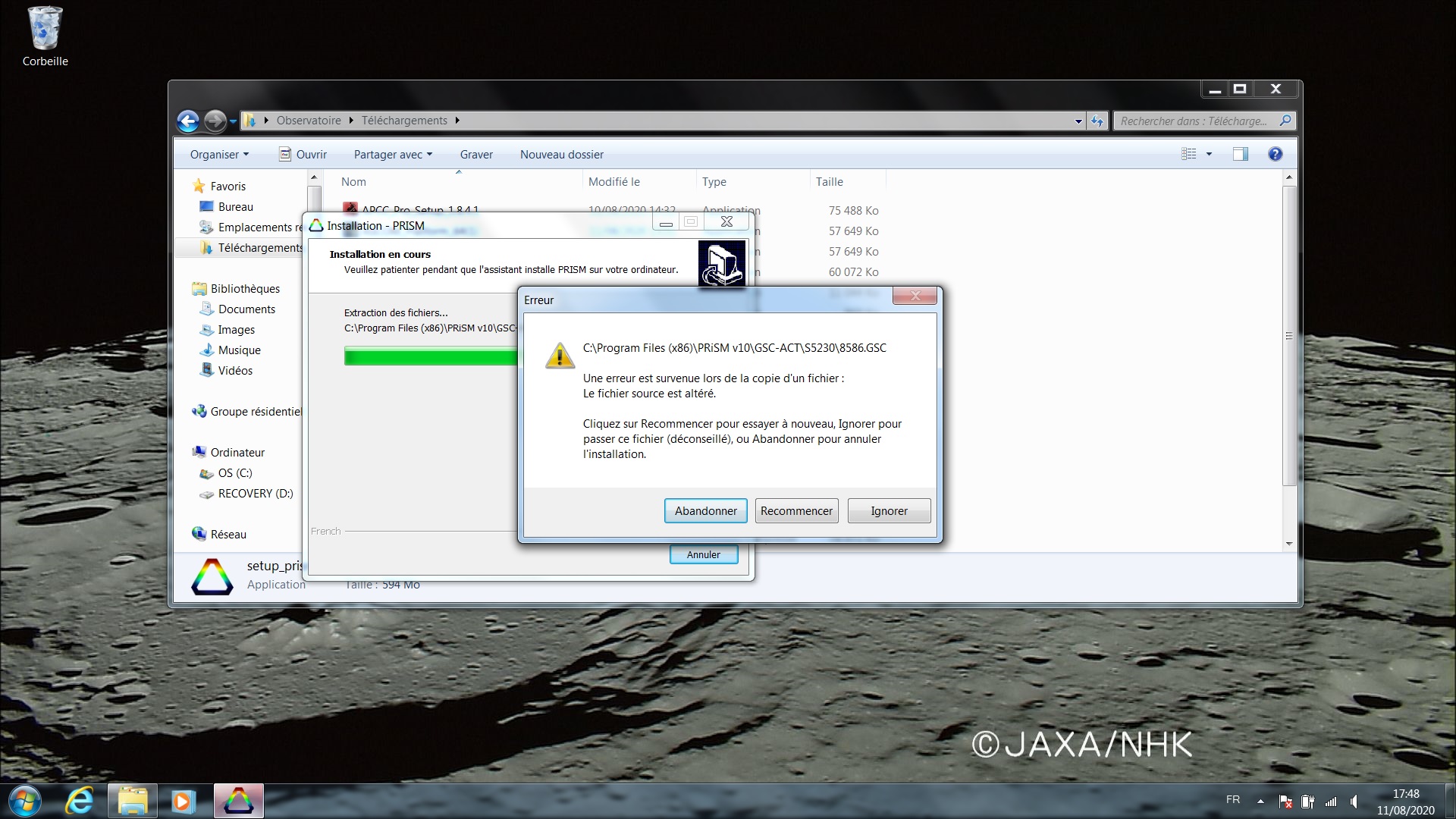 après avoir réinstallé Windows 7 sur ma machine, je cherche à installer Prism mais voilà cette installation n'aboutit jamais. Voilà le message sur lequel achoppe cette installation.
