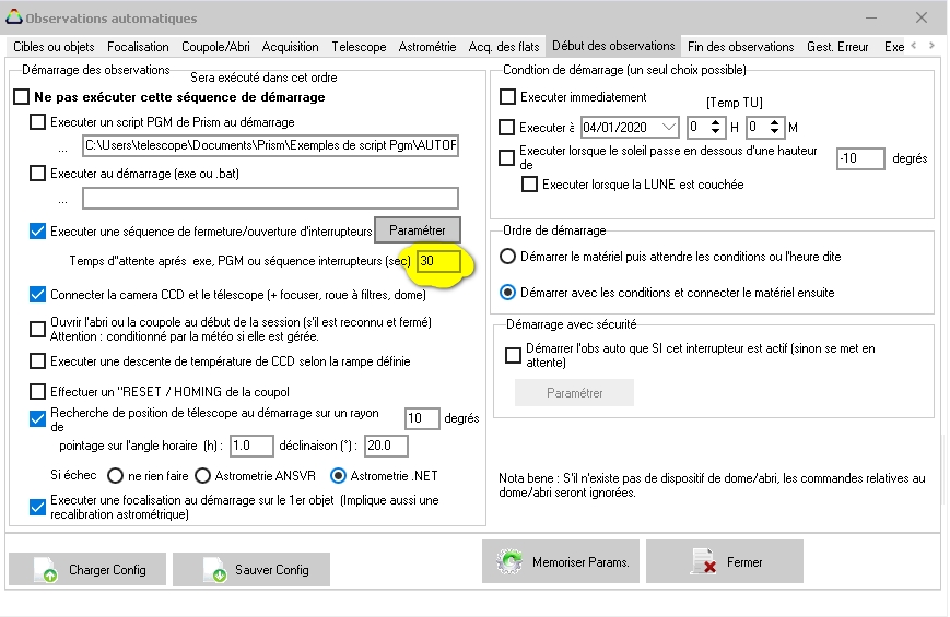 A mon avis c’est cette réinitialisation des valeurs NbSamples_DWN et NbSamples_UP qui provoque la perte de la rampe de température de la CCD. La solution de contournement à cette anomalie est de s’assurer avant de connecter la caméra (prendre en compte un certain temps de démarrage) que celle-ci à terminé son cycle d’initialisation avant de la connecter. Le module OBS-AUTO prévoit bien un temps d’attente entre la mise sous tension des équipements et la connexion logicielle (30 secondes dans mon exemple), ce qui permet normalement de ne pas être confronté à cette anomalie.