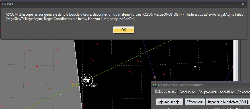 Le message ne me choque pas, le truc embêtant est que Prism déconnecte alors tout le matériel au lieu de simplement m’interdire d'y aller et que je pointe ailleurs. Si en obs. auto on lui demande de pointer un objet qui est encore derrière l'horizon ( vertical à cet endroit pour moi), il se passera quoi ?