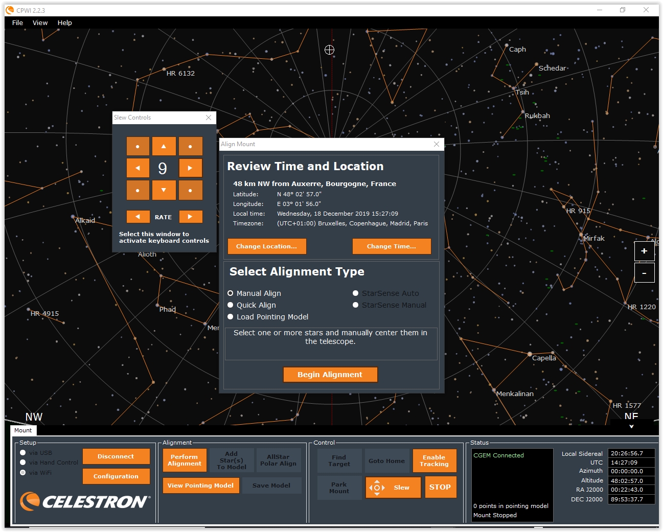 Aujourd’hui j'ai installé le logiciel CPWI de Celestron. Il offre de multiples possibilités de pilotage dont, apparemment, la gestion du pilotage.