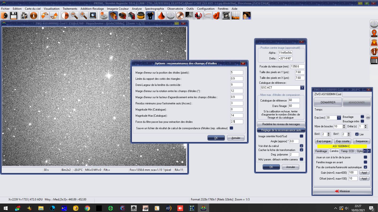 D'ailleurs, j'ai une ASI 1600 MMC, un Newton de 300 à focale 1360 mm. Je dois imager comment en astrométrie ? Car en pleine trame ou en binning 2, j'arrive à faire des la photométrie mais l'astrométrie me résiste méchamment. J'ai remarqué qu'auparavant en bin 2 pleine trame ca fonctionnait. Mais depuis que le beau temps est revenu... rien ?! Pourquoi je n'y parviens pas, c'est dingue