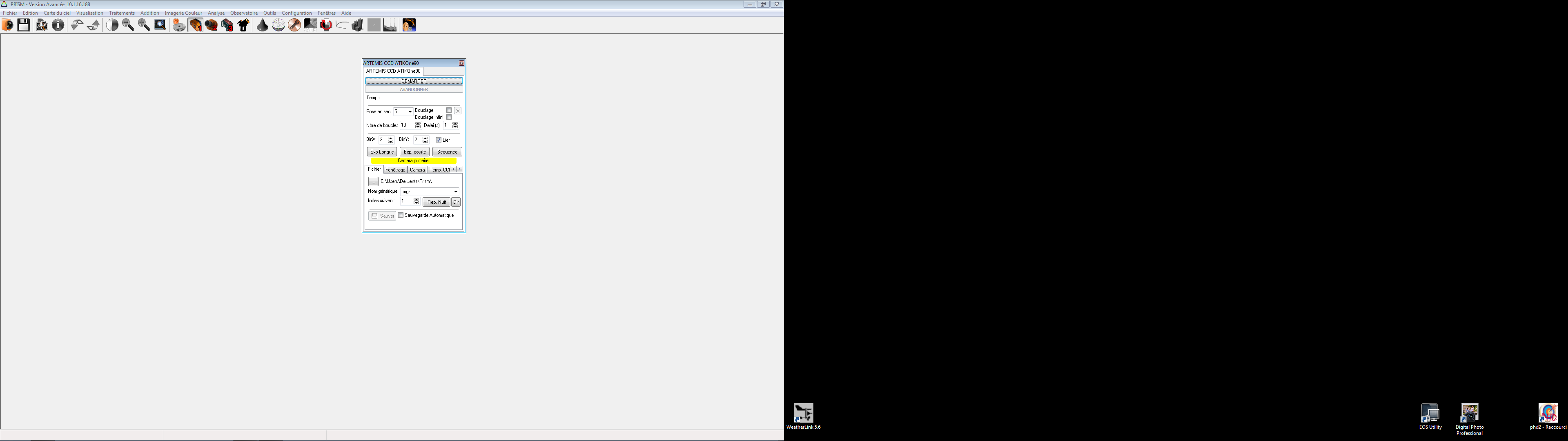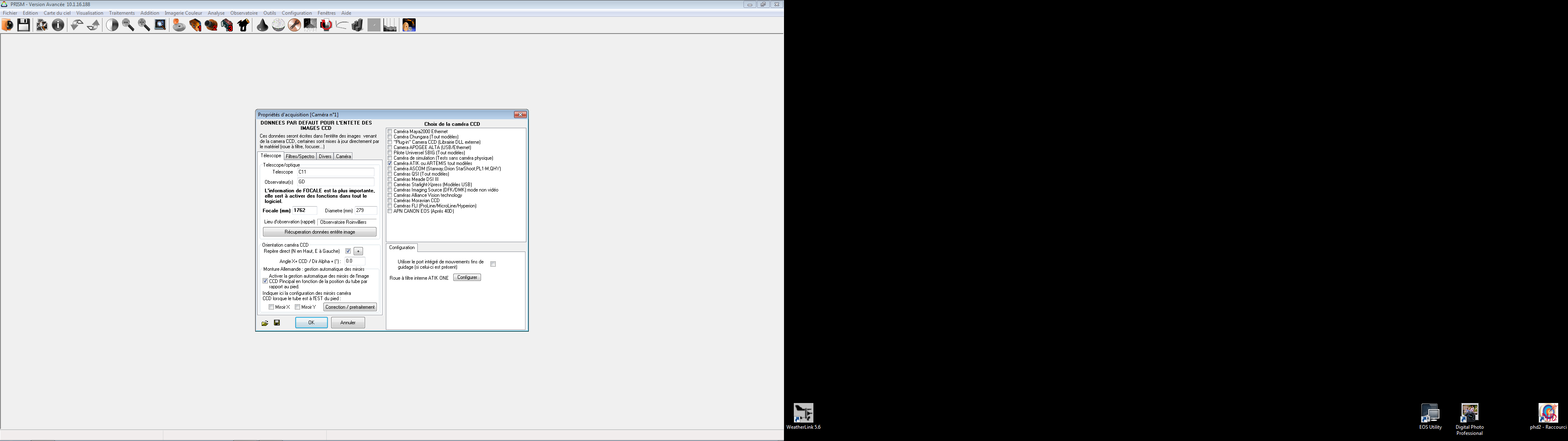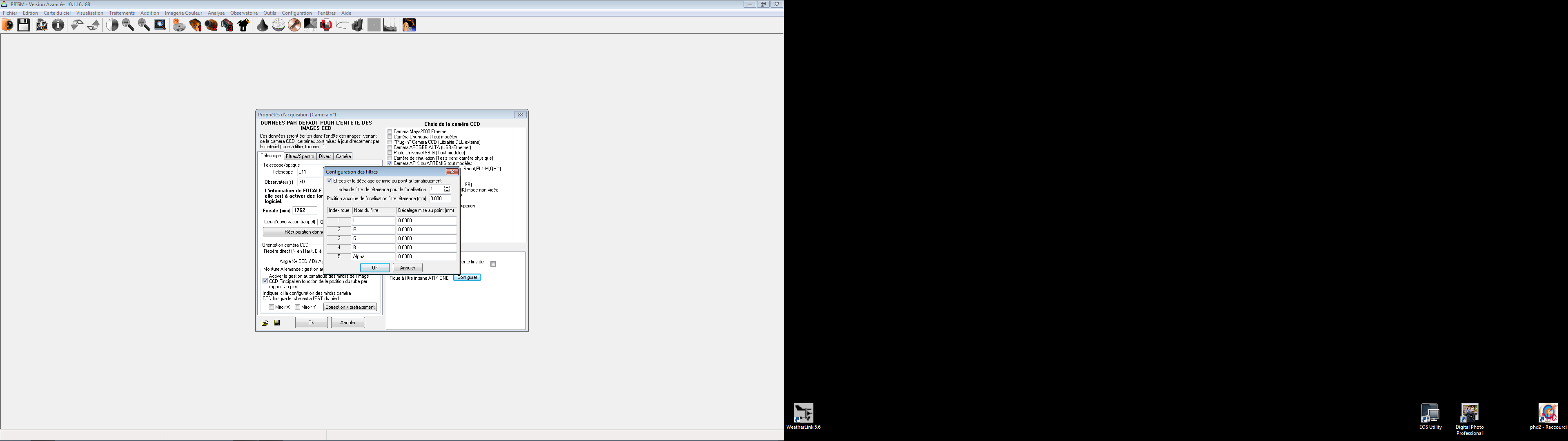 Prism la reconnait sans soucis, configuration Ok, cependant dans la liste d'onglets n'apparait parait pas la roue à filtre? aussi je suis bloqué pour la suite...des états de prise en main de la caméra...