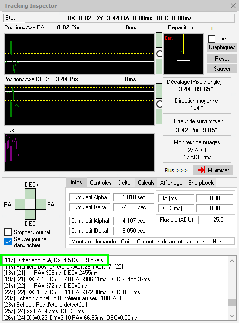 J'ai renseigné la valeur 5 et lancé le guidage. Je constate que dans la fenêtre "tracking inspector" le dither est réalisé.