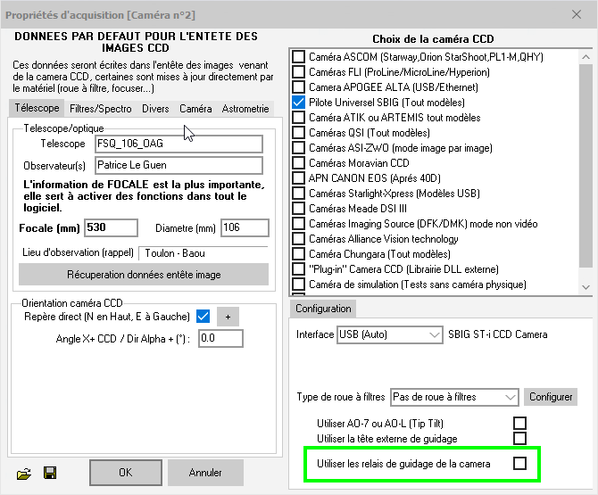 C'est la caméra n°2. Il se trouve que suite à l'arrachement de mon câble de guidage ST4 entre la caméra et les relais de la monture EM200, j'ai configuré la caméra en décochant la case "Ulitiser les relais de guidage de la caméra". La caméra est donc dans le mode "ASCOM compliant guider". C'est peut-être là un indice à explorer.