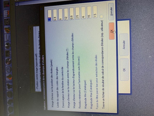 Déjà dans la configuration (ta capture d'écran astrometrie 2.jpg) je te conseille de modifier Magnitude Min (Catalogue), la valeur -6 ne va pas, il faut mettre une valeur de magnitude que tu ne vas pas saturer sur ton image, magnitude 8 ou 10 par exemple à moduler en fonction de ton setup.