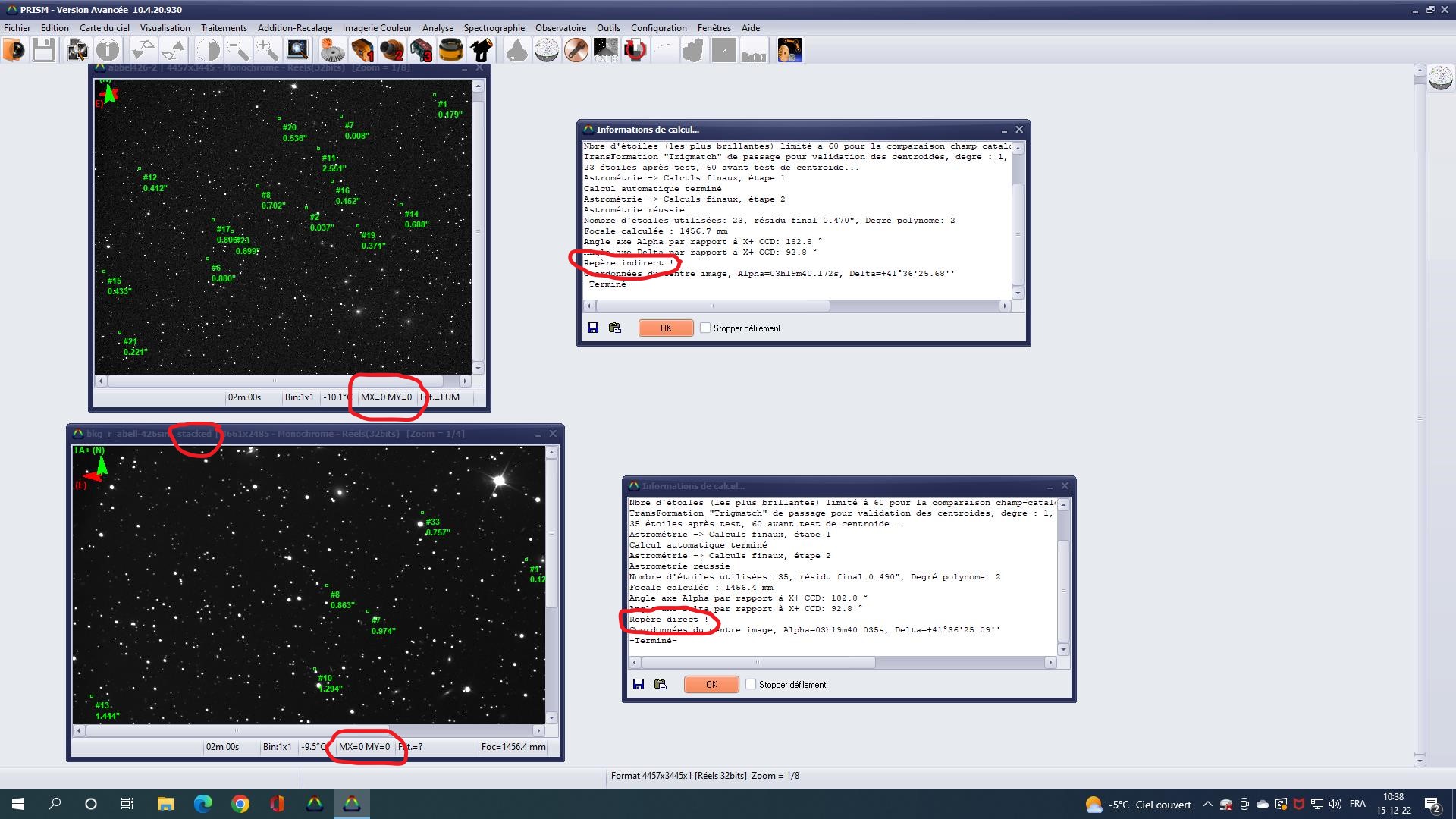 Sur cette copie d'écran, en haut, une image brute sans miroir (MX=0 MY=0). L'astrométrie indique bien l'Est à gauche et le Nord en haut. Alors que l'information de calcul donne un repère INDIRECT.