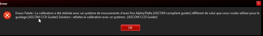 Depuis que ma caméra de guidage est connectée en ASCOM, je ne change plus de driver. Mon problème est donc que à chaque session, quand je démarre la caméra de guidage, j'ai un message d'erreur qui me dit que la calibration a été faite avec un système de mouvements d'axes différent de celui que je veux utiliser pour le guidage : Or, je n'ai absolument pas changé quoi que ce soit dans la configuration des caméras. D'un jour à l'autre, je dois refaire la calibration. Et ça m'empêche d'utiliser un script qui démarre tout seul pour faire une série d'observations. A de très rares occasions, la calibration est conservée. Mais la plupart des fois, je dois la refaire.