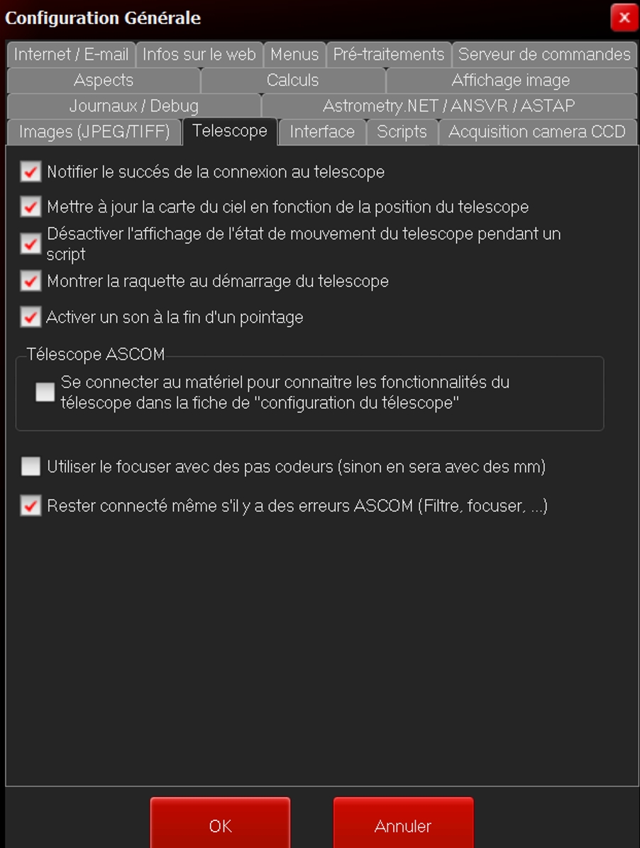 Premier réglage: en ne cochant pas "utiliser le focuseur avec des pas codeurs (sinon on sera avec des mm) dans "configuration générale de Prism"