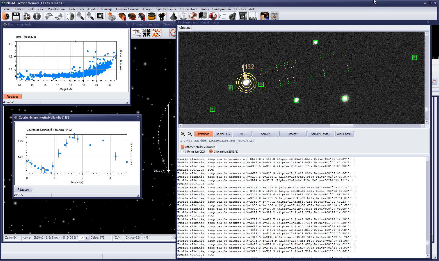 J'ai une pile de 61 images sur un astéroïde que je souhaite mesurer avec la fonction "photométrie sur une série d'images". Or de nombreuses valeurs sont éliminées et je ne sais pas pourquoi. Les rayons de mesure photométrique me paraissent pourtant bien adaptés. J'ai comme valeurs 10 ; 16 et 20. Le seuil de saturation est mis à 100000, le nombre d'étoiles de référence est à 5 et la zone de recherche est étendue à 6 pixels (ce qui normalement n'est pas un soucis avec ma config monture+optique). Pour info, la FWHM des étoiles est à 4.6pix soit 3.2 arcsec ; avec mes 2.27m de focale, mon échantillonnage est donc correct.