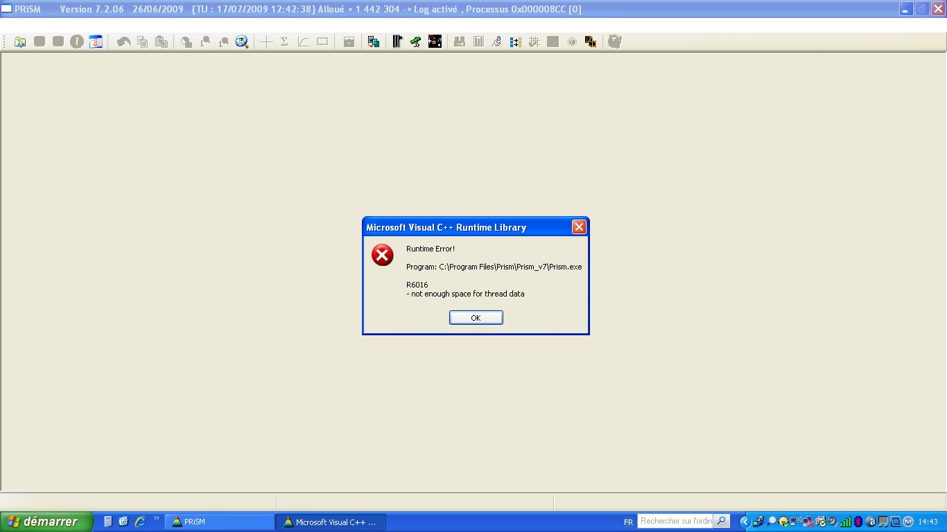 Compte tenu que le message parle de code C++ ou C# (Microsoft visual C++), l'erreur n'est pas dans Prism, mais dans une DLL de ton systeme...