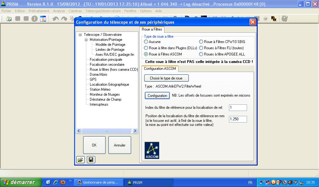 Alors que tout fonctionnait correctement après plusieurs essais, j'ai maintenant systématiquement ce message d'erreur : "Guidage par ASCOM (périphérique dédié) : n'a pas été configuré correctement" quand je connecte le télescope (LX200). Pourtant, dans le panneau de configuration du télescope tout est OK concernant la roue à filtre. Si je sort de PRISM pour utiliser la roue à filtre dans un autre logiciel, tout fonctionne. Je reviens dans PRISM et de nouveau ce message d'erreur..