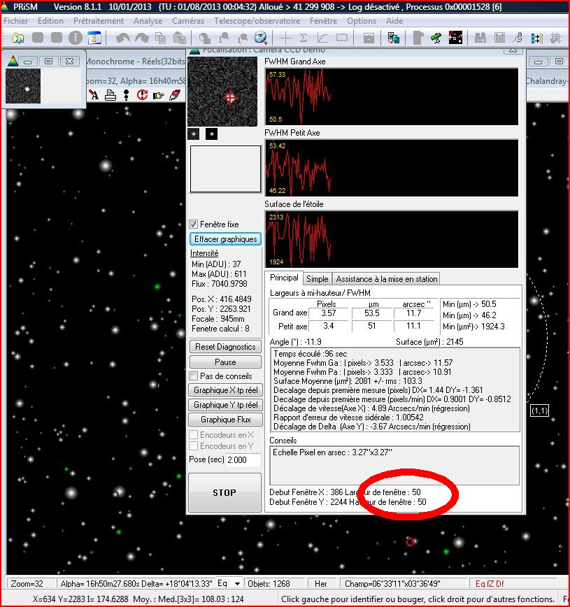 Effectivement, j'utilise une focale de 2800mm, et à l'inversion de sens avec le shifting naturel de l'instrument, l'étoile sélectionnée pour la MAP sort du champ (de la fenêtre). Est-il donc possible de mettre d'autres valeurs de largeur de fenêtre (par défaut fixé à 50 pixels). Malheureusement, je n'utilise pas de focuser digne de ce mon, ce qui serait une solution à mon problème (plus de shifting).