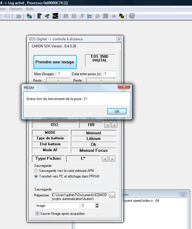 Je souhaite faire de l’acquisition d’images avec un APN Canon 350D via un script. Or que j’utilise ou non un script, Prism me renvoie toujours le message d’erreur « Erreur du lancement de la pose : 2 ! » juste après avoir lancé la pose.
