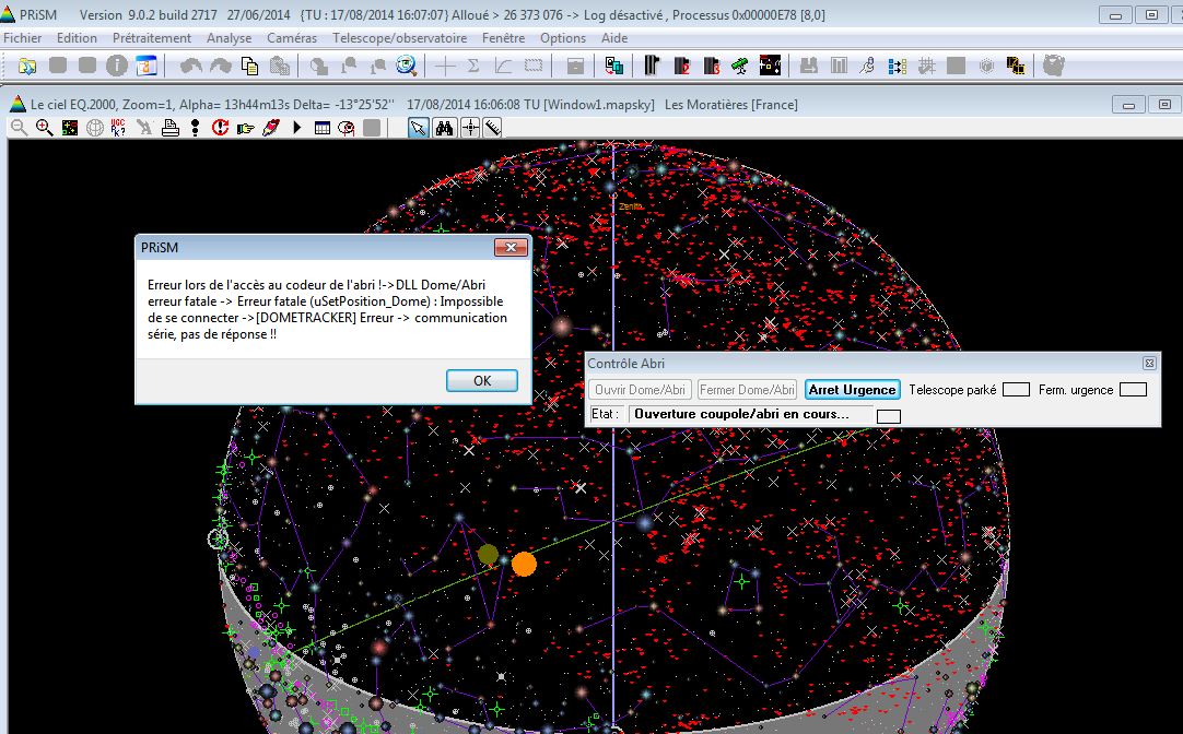 j'ai aussi un problème avec le dometracker qui refuse de fonctionner avec Prism v9 (avec la dll ou le pilote ASCOM) alors qu'il marche parfaitement avec le logiciel de test du dometracker ou en ASCOM.