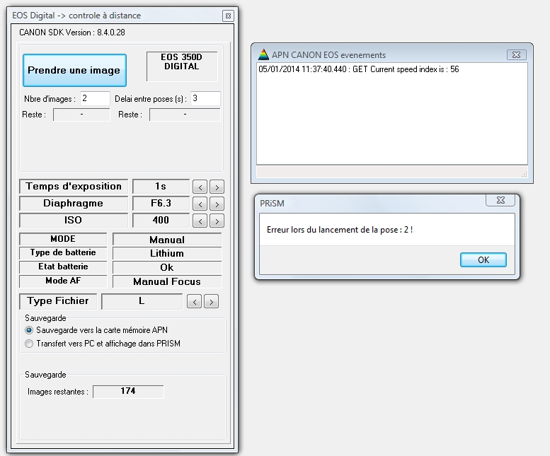 Je souhaite faire de l’acquisition d’images avec un APN Canon 350D via un script. Or que j’utilise ou non un script, Prism me renvoie toujours le message d’erreur « Erreur du lancement de la pose : 2 ! » juste après avoir lancé la pose.